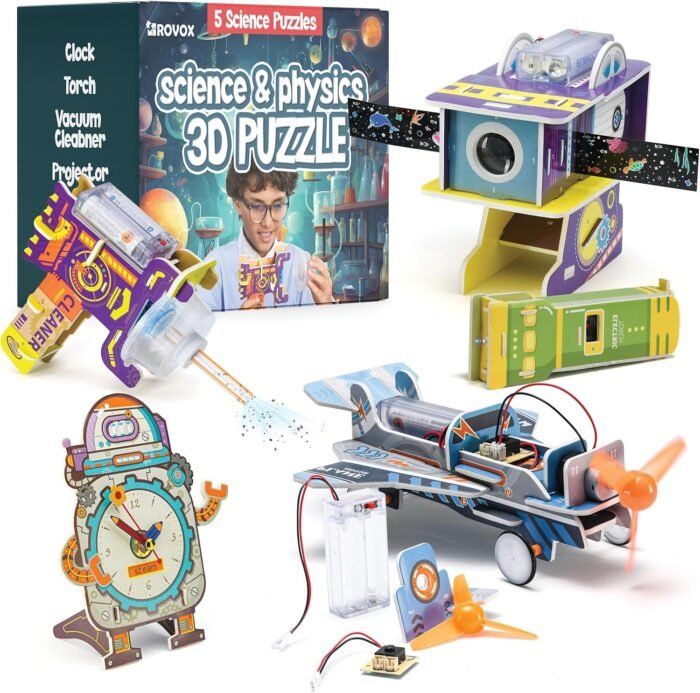 Introducing the Rovox 5 in 1 3D Puzzle Science Kit: A captivating DIY Battery & Motor Powered Model STEM Kit, Immerse yourself in the world of scientific wonders with this extraordinary kit that includes five mind-boggling puzzles. Each puzzle offers a unique and educational science experience, for endless hours of entertainment and fun for children and adults alike. The best part? No tools needed! The Rovox 5 in 1 kit features an ingenious design that allows you to effortlessly assemble each puzzle, making it accessible and enjoyable for everyone. Let’s explore the exciting puzzles included in this kit: Vacuum cleaner: Real working vacuum cleaner which can pick up dust. Electric Airplane: Experience the power of batteries and a motor as you create a real working airplane with a turning propeller. Flashlight: Real working flashlight that works with batteries and the included bulb. Analog Clock: Create this stunning clock which works really well and place it on your school desk or room. . Projector: Be amazed how you can build your own movie projector and understand the science behind it. With a little help from the included manual, each puzzle can be built by you, empowering you to become a master creator. The Rovox 5 in 1 kit is designed for ages 8 and above, promoting hands-on learning, problem-solving, and sparking curiosity in budding scientists. Unleash your imagination and dive into the world of imagination works science with the 5 in 1 3D Puzzle Science Kit, by Rovox