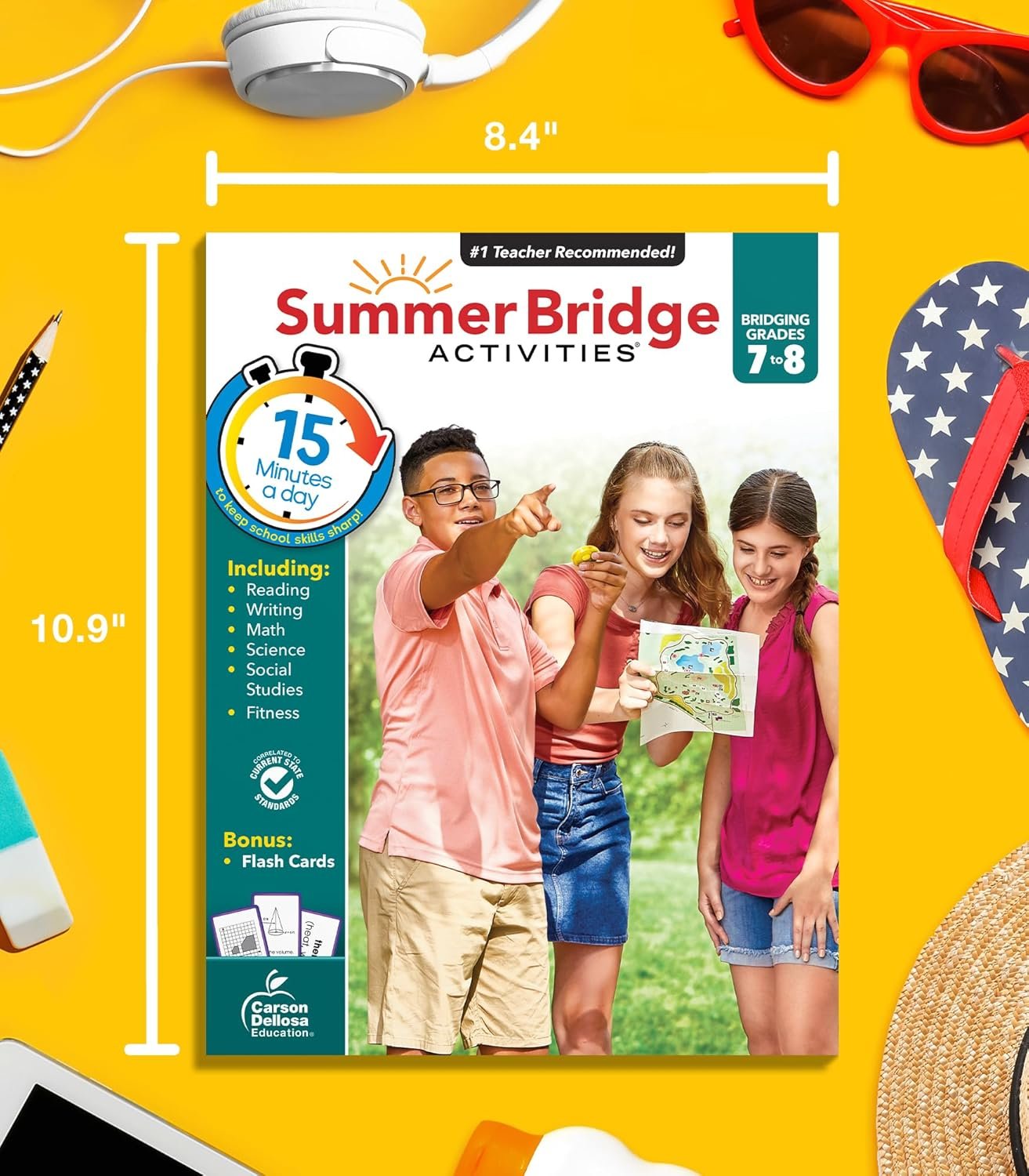 Summer Bridge Activities 7th to 8th Grade Workbooks All Subjects, Middle School Books With Math, Reading Comprehension, Science, Fitness, Social Studies, Writing Practice, and Flash Cards