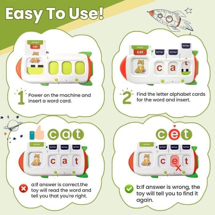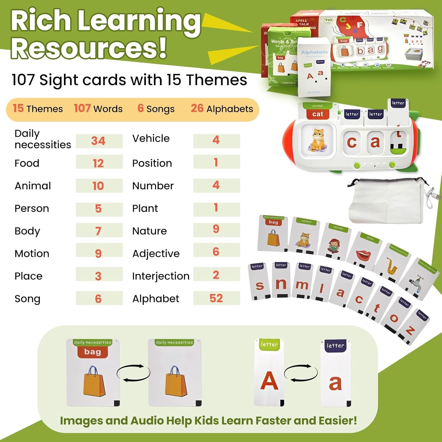 Spelling Sight Words Flash Cards: spelling & talking alphabet flash cards and sight word flashcards.This cvc word learning card set utilizes “CVC word spelling games” to assist children in learning and consolidating CVC words.These talking cards adopt an interactive approach,making learning fun and Helping kids expand their vocabulary.