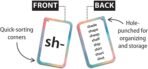 This flash card set contains a collection of full-color, high-interest student cards as well as instructions and tips for the teacher or parent, suggested activities, and additional blank cards. Each card has a hole in the top corner that can be fit with a ring or string to help with organization and storage. Additionally, each card has one corner that is shaped differently than the others. By lining up the non-rounded corners, the flash cards can quickly be faced in the same direction.
