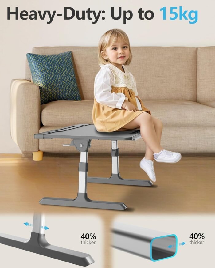 LARGE AND STABLE SURFACE: The BAWADE adjustable lap desk for adults offers an extra-large 23.6″ x 17.7″ PVC leather tabletop, providing ample, textured space for your devices. Scratch-resistant and easy to clean, it ensures long-lasting use. Robust legs with non-slip foot pads offer superior stability and durability, supporting up to 15kg.