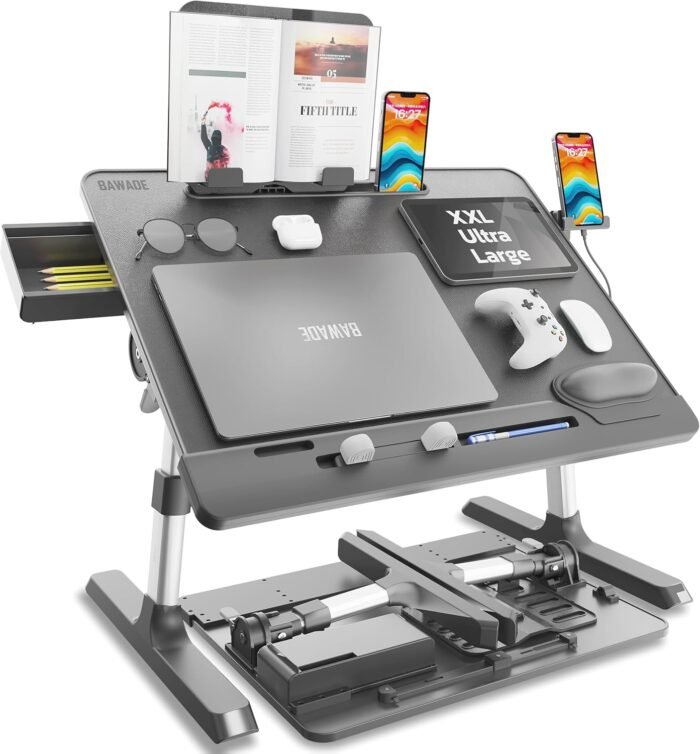 X-Large Adjustable Laptop Table for Bed, Desk for Laptop and Writing with Book Stand/Drawer/Wrist Cushion/Phone Holder, for Working, Study, Writing, Eating – Gray