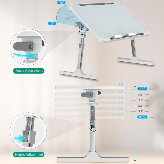 💦【Adjustable Laptop Desk】This is ergonomic design bed table, the double removable stoppers protect your laptop from falling down. Which laptop bed desk is adjustable angles and heights allow you to customize laptop bed tray table to a good position, 6 adjustable heights(10.4″-15″) and free adjustable angles (0-70°) provide you a more comfortable posture and avoid back & neck pain.